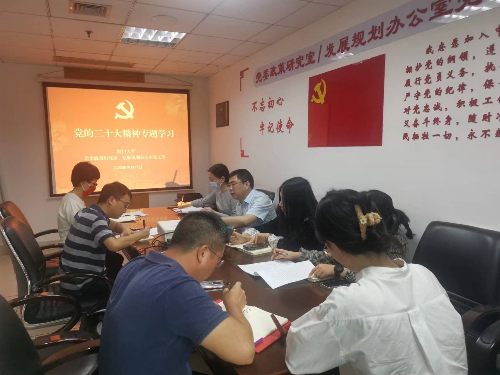 10月17日上午,党委政策研究室、发展规划办公室党支部组织开展党的二十大精神专题学习,支部全体党员参加了学习。支部书记黄新华带头领学党的二十大报告,并围绕报告中“实施科教兴国战略,强化现代化建设人才支撑”“推进文化自信自强,铸就社会主义文化新辉煌”等内容,结合办公室实际工作进行重点解读。