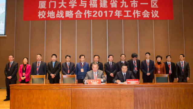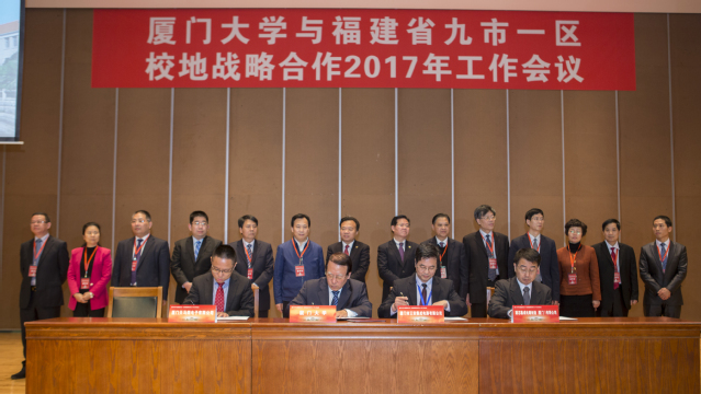 3月11日,厦门大学与福建省九市一区校地战略合作2017年工作会议在我校科学艺术中心召开。省发改委、教育厅、科技厅、经信委、海洋与渔业厅,省各地市(区)政府、部门、企业代表和我校校院领导、专家学者500多人共聚一堂,共商校地合作对接、共谋服务福建发展。《厦门大学服务福建发展年度报告(2016)》同期发布。
